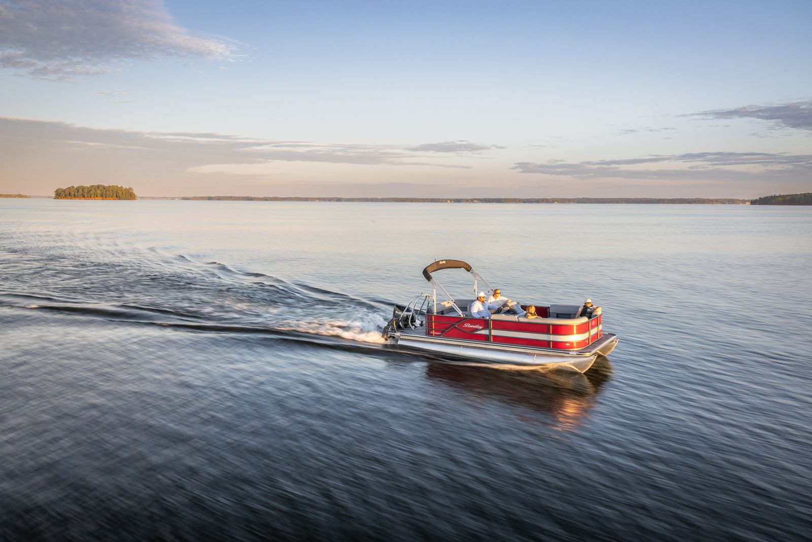 A traditional pontoon will likely serve you beautifully. Most pontoons are powered between 90–150 HP and cruise comfortably in the 20–30 mph range.